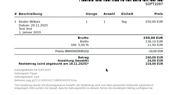 Der Promogutschein wird in der Rechnung dann auch entsprechend inkl. Promocode aufgelistet: