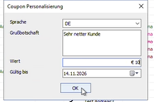 Natürlich kann man den Gutschein auch individuell mit einer Grußbotschaft versehen, dazu klickt man beim Verkauf einfach bei den Pfeilen auf Personalisieren.