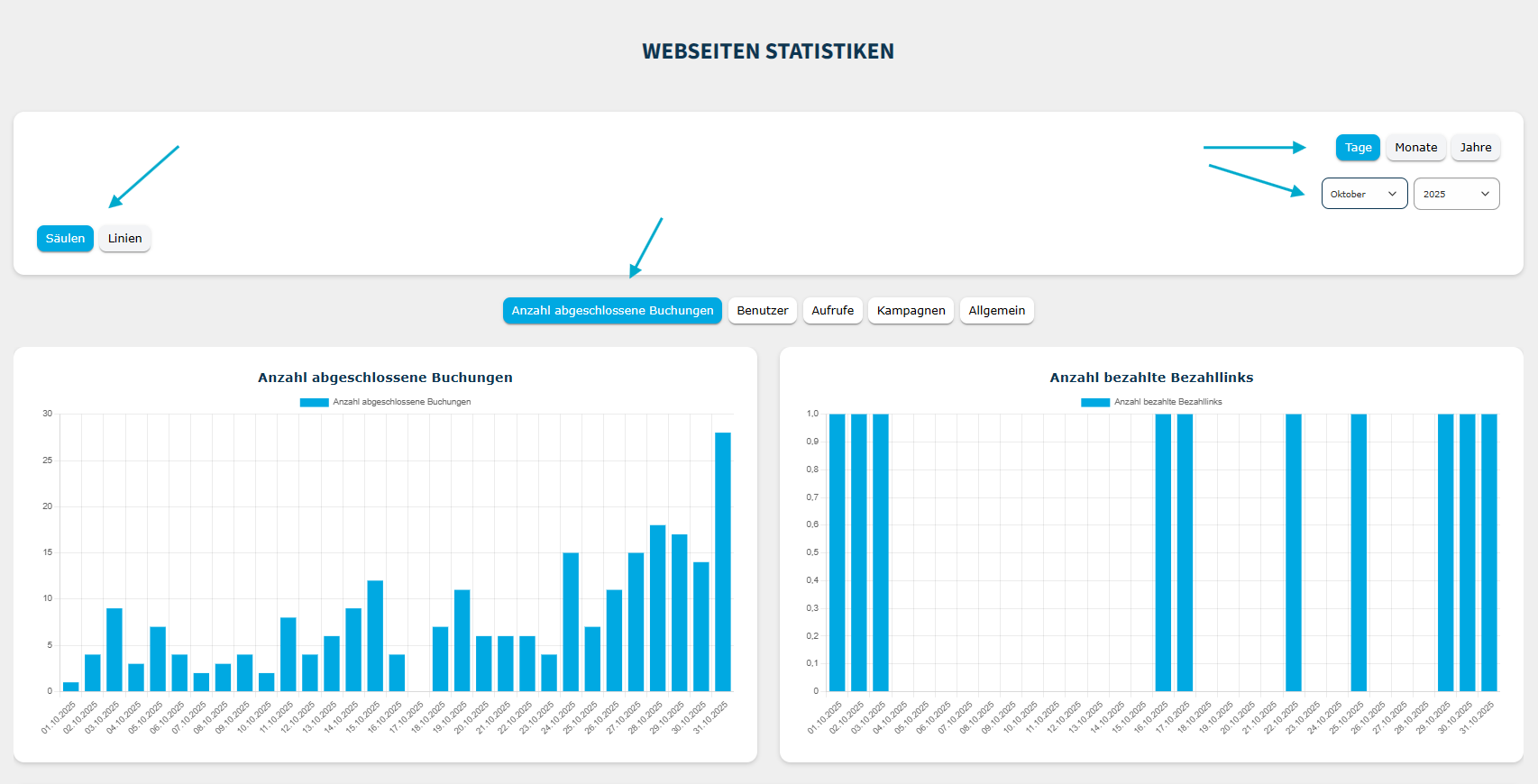 - Anzahl der abgeschlossenen Buchungen: Wie viele Onlinebuchungen wurden im gewählten Zeitraum abgeschlossen.