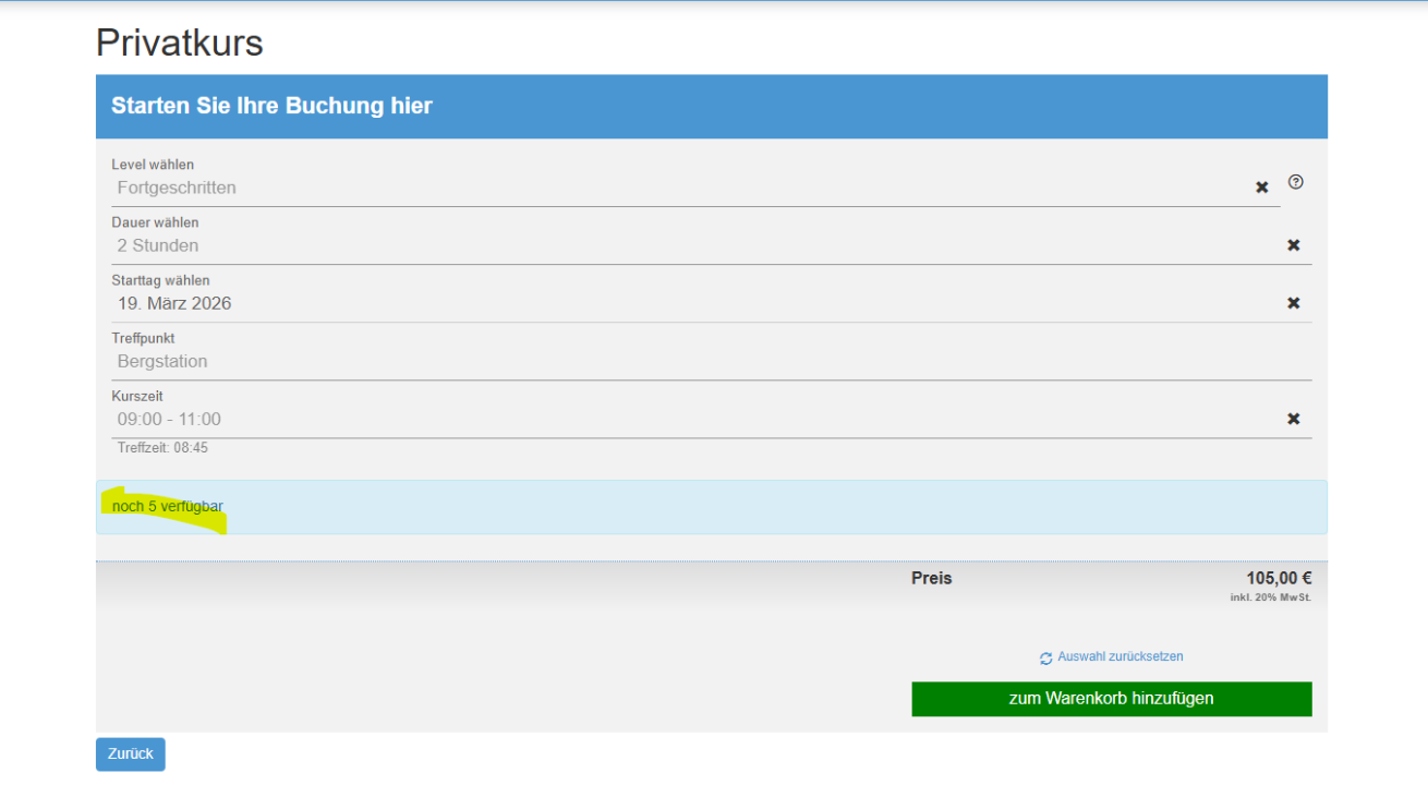Du kannst jetzt selbst festlegen, bis zu welcher definierten Anzahl verfügbare Plätze im Onlineshop angezeigt werden. So vermeidest du unnötigen Buchungsdruck oder unerwünschte Dynamiken, wenn es knapp wird – und steuerst die Darstellung ganz nach deiner Strategie.
