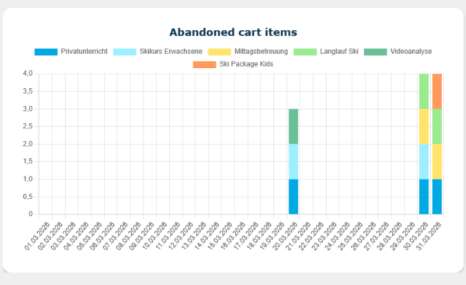 In Typo3 unter WS Analytics – Abandoned cart items können nun für jeden Tag alle nicht abgeschlossenen Warenkörbe ausgelesen werden. Die darin enthaltenen Artikel werden gezählt und aufgelistet.